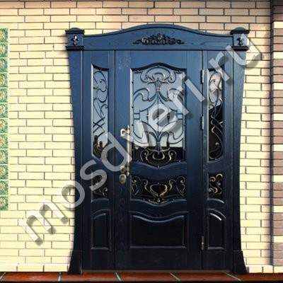 Элитная парадная дверь из черного массив дуба со стеклом, ковкой и резьбой по дереву